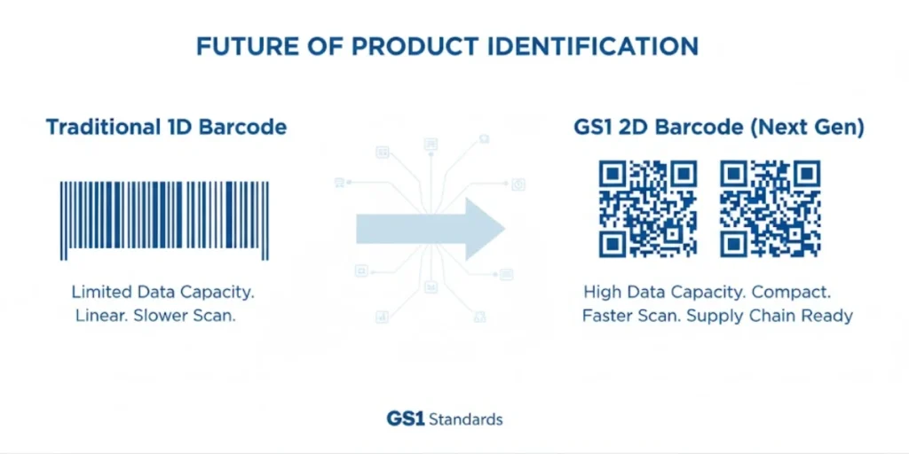 GS1 allows a transition period where both 1D and 2D barcodes can appear on the same package. This makes the shift low risk.