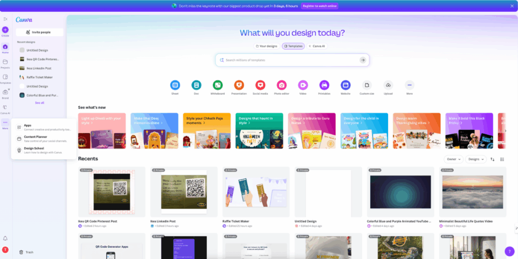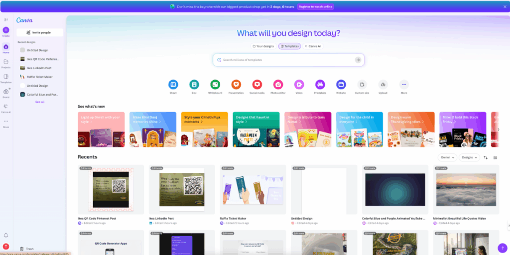 Once logged in, you’ll land on the Canva home dashboard, where you can access all your recent designs and templates.