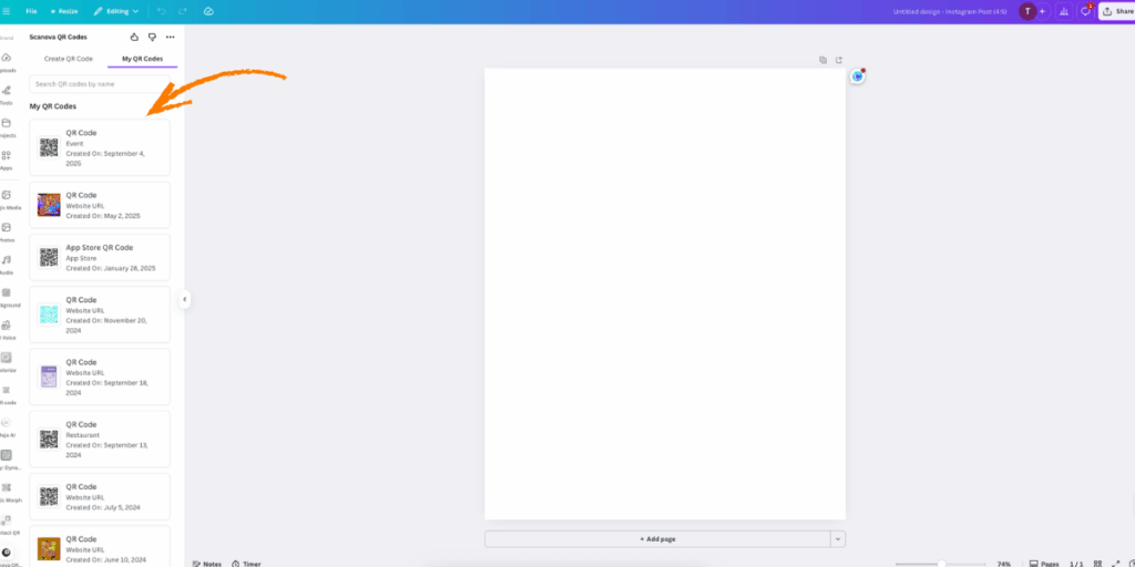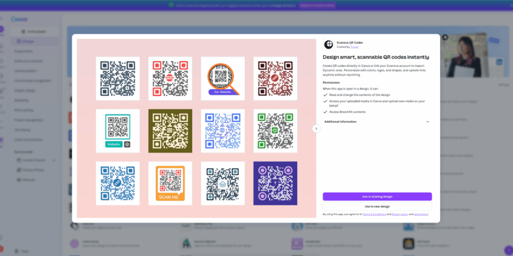 This secure integration ensures your previously created QR Codes are linked directly within Canva.