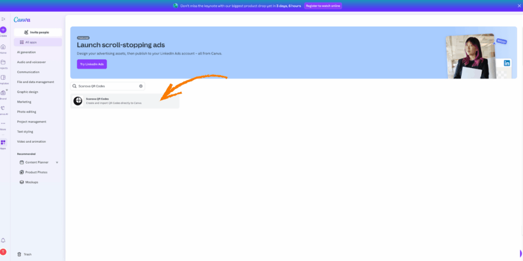 - Open Canva → Go to Apps → Search “Scanova QR Codes”