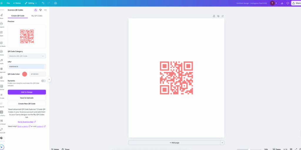 This built-in tool allows you to enter a URL and instantly add a QR Code to your design. However, Canva’s native QR Code feature can only create static QR Codes.