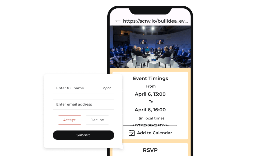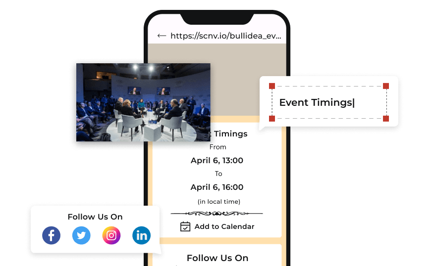 Concevez une page de destination personnalisée avec description de texte, des images de haute qualité, un calendrier d'événements détaillé, des informations complètes sur le lieu, des coordonnées, des widgets de médias sociaux, etc. Avec la possibilité de modifier des informations liées à tout moment, vous pouvez vous assurer que les participants ont toujours des détails pertinents.